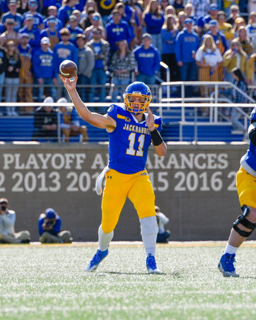 The Jackrabbit quarterback room returns one of the top QBs in the FCS in #11 Mark Gronowski (6-3, 220, JR). Mark’s starting record is well documented (22-3 and 22-1 in games vs. FCS and finished). According to Coach Lujan, Mark has taken another jump athletically this offseason. He says that Mark also has full ownership of the offensive playbook. In 2022 he passed for 2,967 yards and 26 TDs to 5 interceptions while completing 65.2% of his passes. For much of the regular season the offense protected Mark and didn’t ask him to run the ball very frequently as he recovered from his knee injury. However, he still finished with 543 gross yards and 12 more touchdowns. The Jacks unleashed Mark’s running ability in the post season where in the four playoff games alone, he rushed for 229 yards on 33 carries with 4 touchdowns. After working off some rust early in the season, Mark showed his ability to make all the throws that this offense needs. One of the things that truly sets Mark apart is his ability to extend plays with his legs AND still make good decisions with the football. If Lujan’s statements are true about Mark making a jump athletically and having complete ownership of the playbook, watch out MVFC!